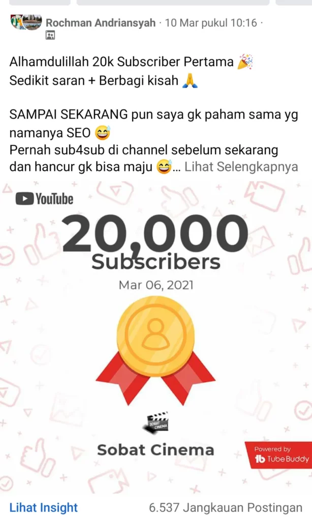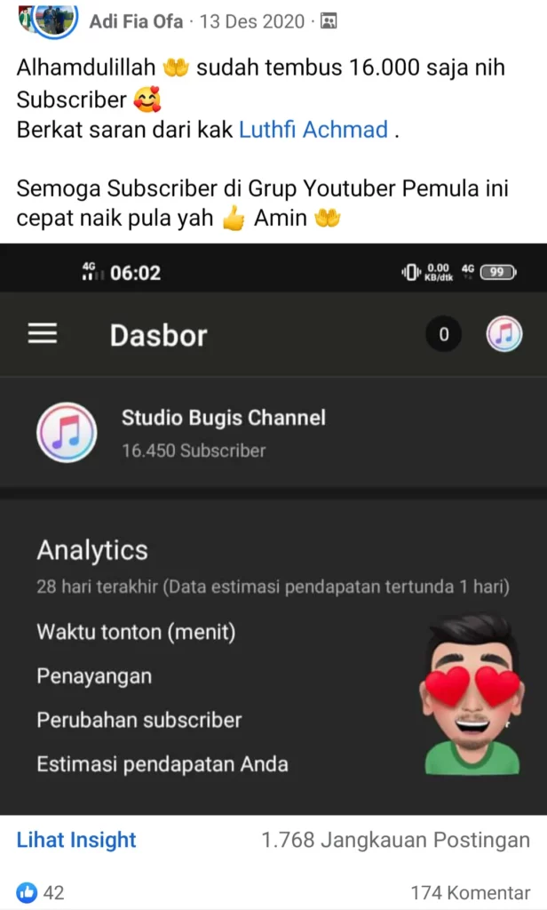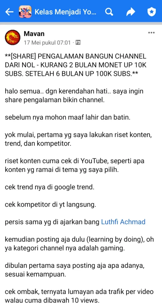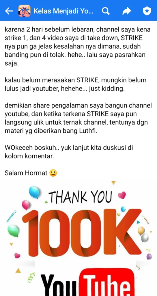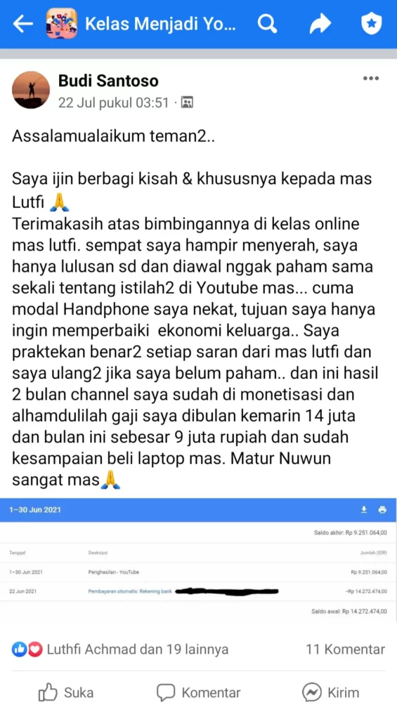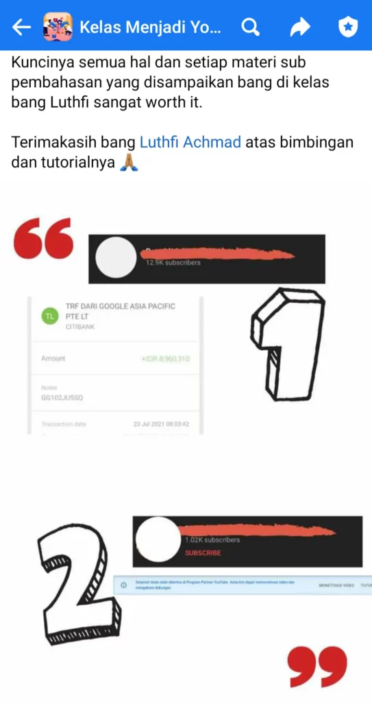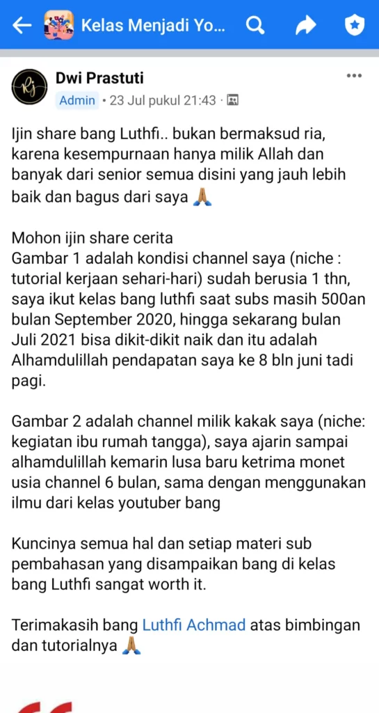 “Sebelumnya channel saya tersendat walaupun sudah monetisasi tp penghasilan masih sedikit dan bingung menentukan ide konten seperti apa. Sejak menonton kelas online mas luthfi saya jadi mengerti bagaimana mencari ide konten & mengemas sebuah video dan Alhamdulillah dalam waktu 2 bulan ada views saya yang menyentuh 148ribu views. Dan sejak saat itu subscribers saya ikut nambah sebanyak 3000 lebih, dan video2 lama views nya ikutan naik. Dari situ Alhamdulillah penghasilan saya naik juga. Terimakasih atas ilmunya mas luthfi, sangat bermanfaat utk perkembangan channel saya “