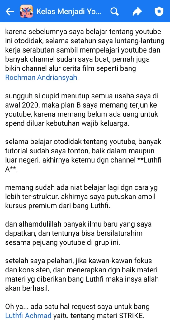 “Sejak saya ikut kelas ini yg saya rasakan pencerahan, pencerahan, pencerahan, sehingga tiap hari teredukasi, tersemangati, terinspirasi. Trimakasih mas Lutfhi, edukasi youtube anda memang beda…”